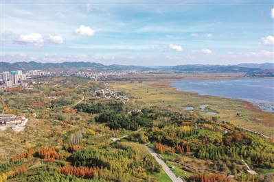 俯瞰威宁草海北坡生态公园,像一块天然的调色盘。