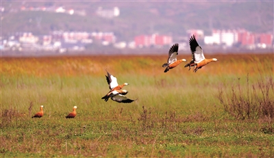 贵州草海国家级自然保护区喽啰山的赤麻鸭振翅起飞。