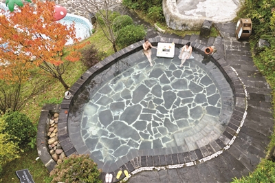 游客在百里杜鹃彝山花谷景区内,体验惬意的温泉之旅。