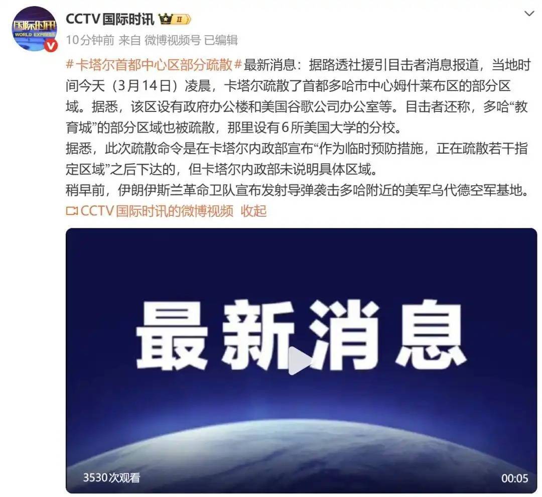 据路透社援引目击者消息报道,当地时间今天(3月14日)凌晨,卡塔尔疏散了首都多哈市中心姆什莱布区的部分区域。据悉,该区设有政府办公楼和美国谷歌公司办公室等。目击者还称,多哈“教育城”的部分区域也被疏散,那里设有6所美国大学的分校。 据悉,此次疏散命令是在卡塔尔内政部宣布“作为临时预防措施,正在疏散若干指定区域”之后下达的,但卡塔尔内政部未说明具体区域。 稍早前,伊朗伊斯兰革命卫队宣布发射导弹袭击多哈附近的美军乌代德空军基地。